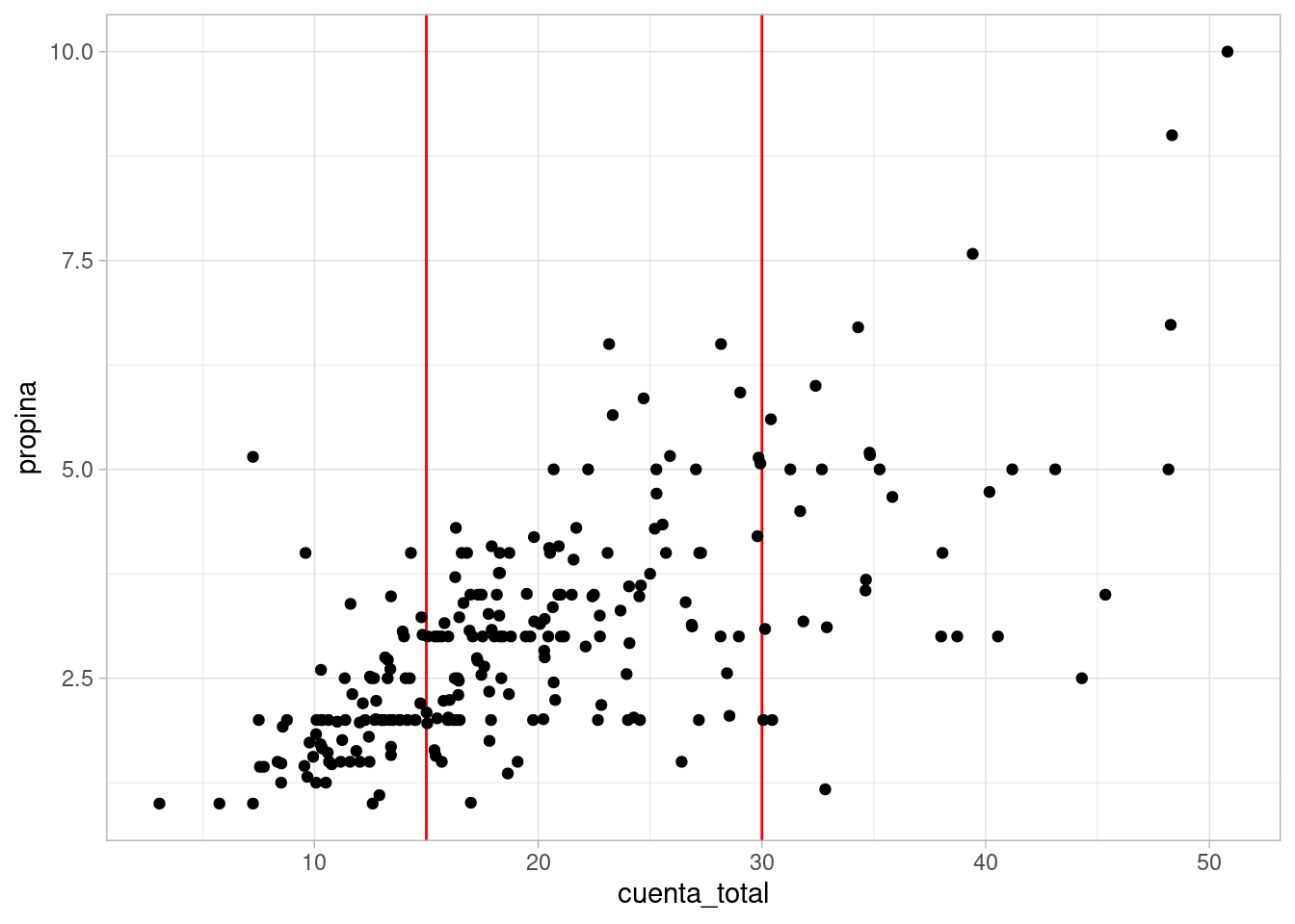 Conde confirmamos que el nivel general de propinas es más alto alrededor de cuentas de total 30 que de total 15, y la dispersión también es mayor. Podríamos hacer un diagrama de caja y brazos también.