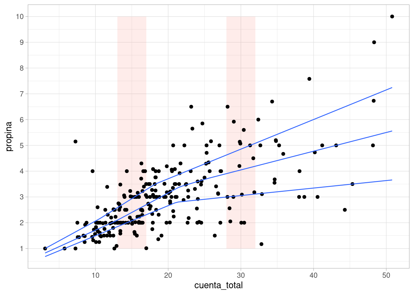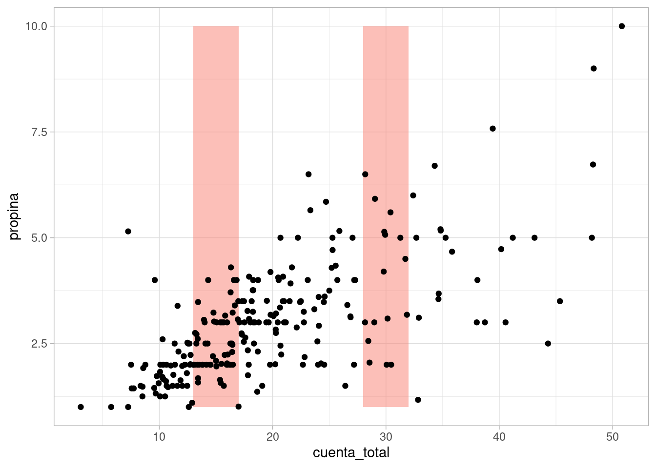 - Consideramos valores de propina asociados a cuentas totales en un intervalo \([x-e, x+e]\).