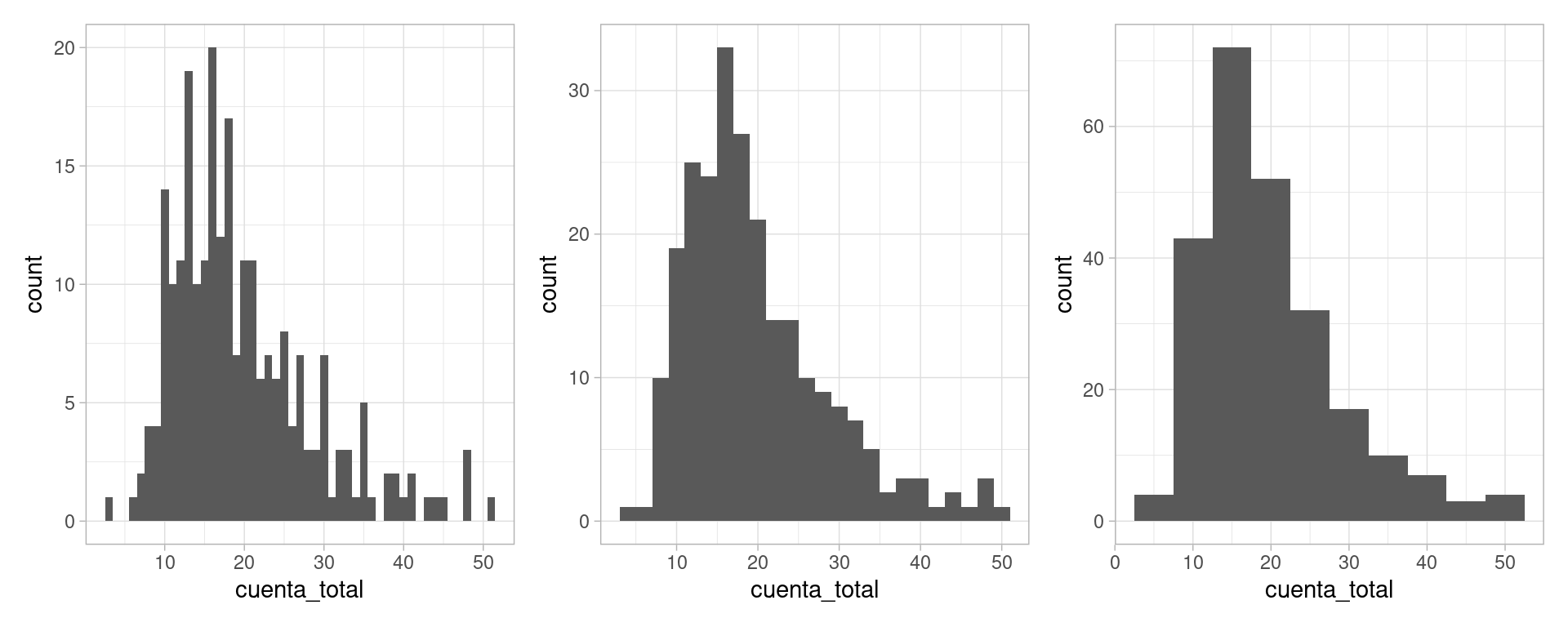 En algunos casos, es más natural hacer un histograma, donde dividimos el rango de la variable en cubetas o intervalos (en este caso de igual longitud), y graficamos cuántos datos caen en cada cubeta: