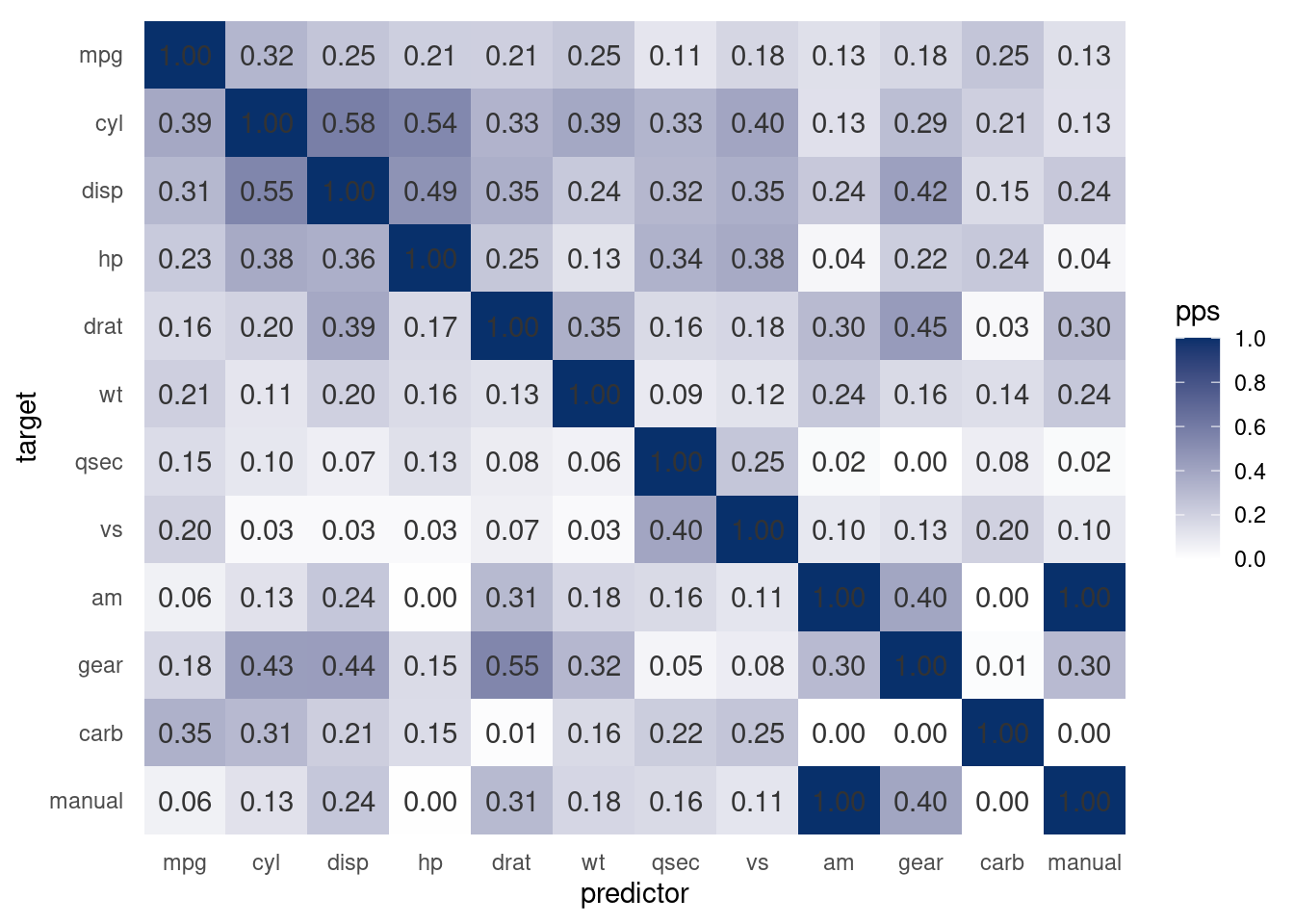 #> 10 vs gear predictive power score 0.05717949 MAE