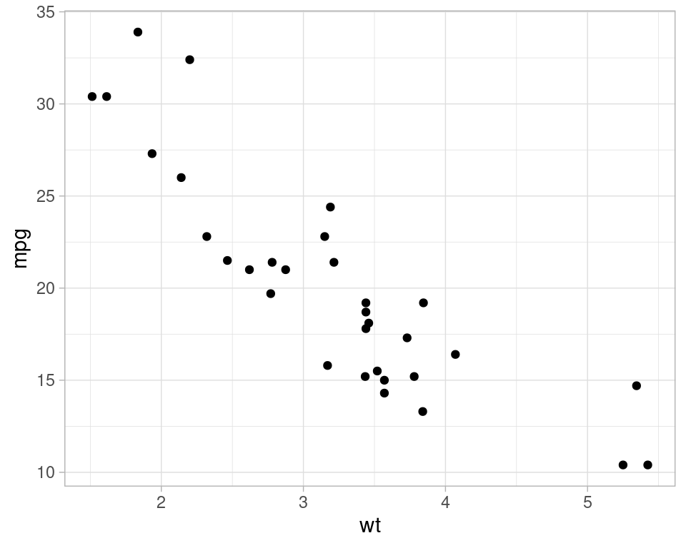 ggplot(mtcars, aes(x = wt, y = mpg)) + geom_point()