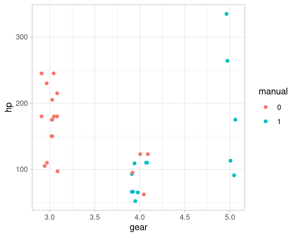 ggplot(mtcars, aes(x = gear, y = hp, colour = manual)) +