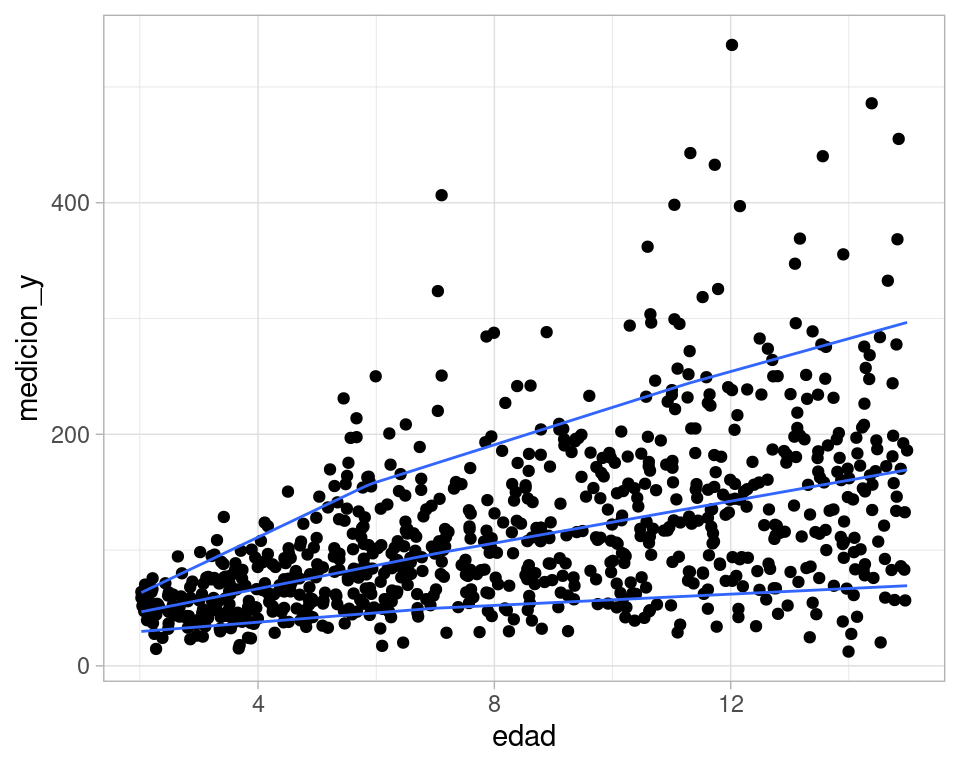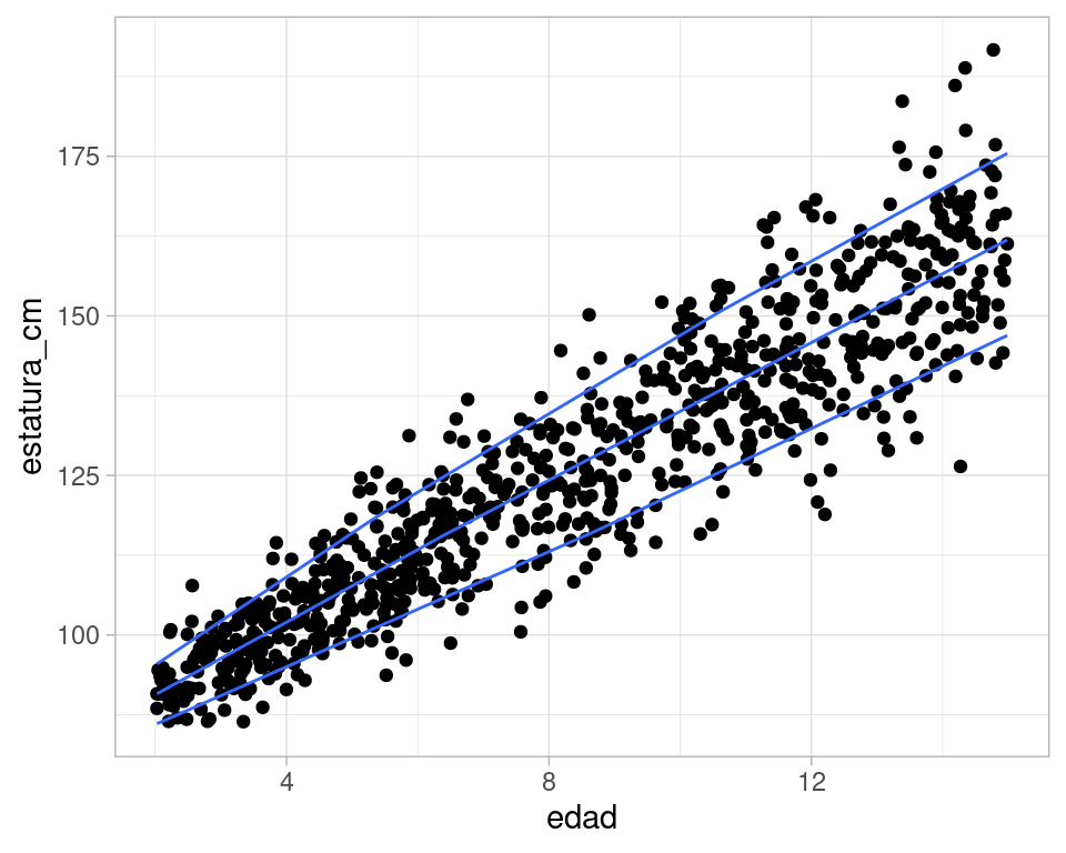 - Obsérvese cómo en efecto la estatura esperada aumenta con la edad (condicional a la edad), y que la dispersión de estatura aumenta conforme la edad aumenta.