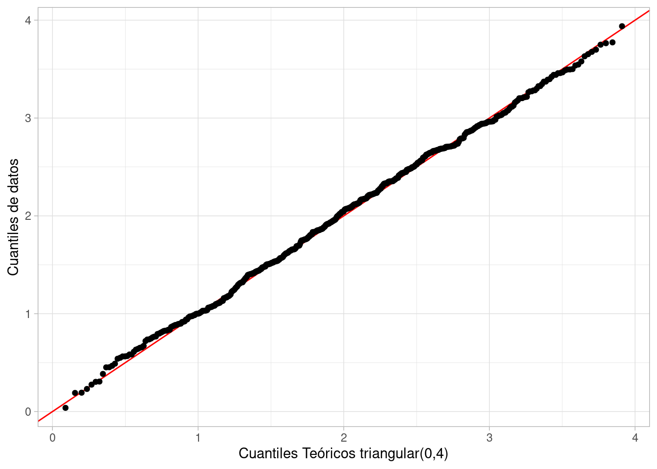 xlab("Cuantiles Teóricos triangular(0,4)") + ylab("Cuantiles de datos")