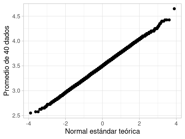 Y vemos que son muy similares los cuantiles empíricos y teóricos. Una mejor manera de considerar esta similitud es graficando todos los cuantiles empíricos y comparándolos con los teóricos: