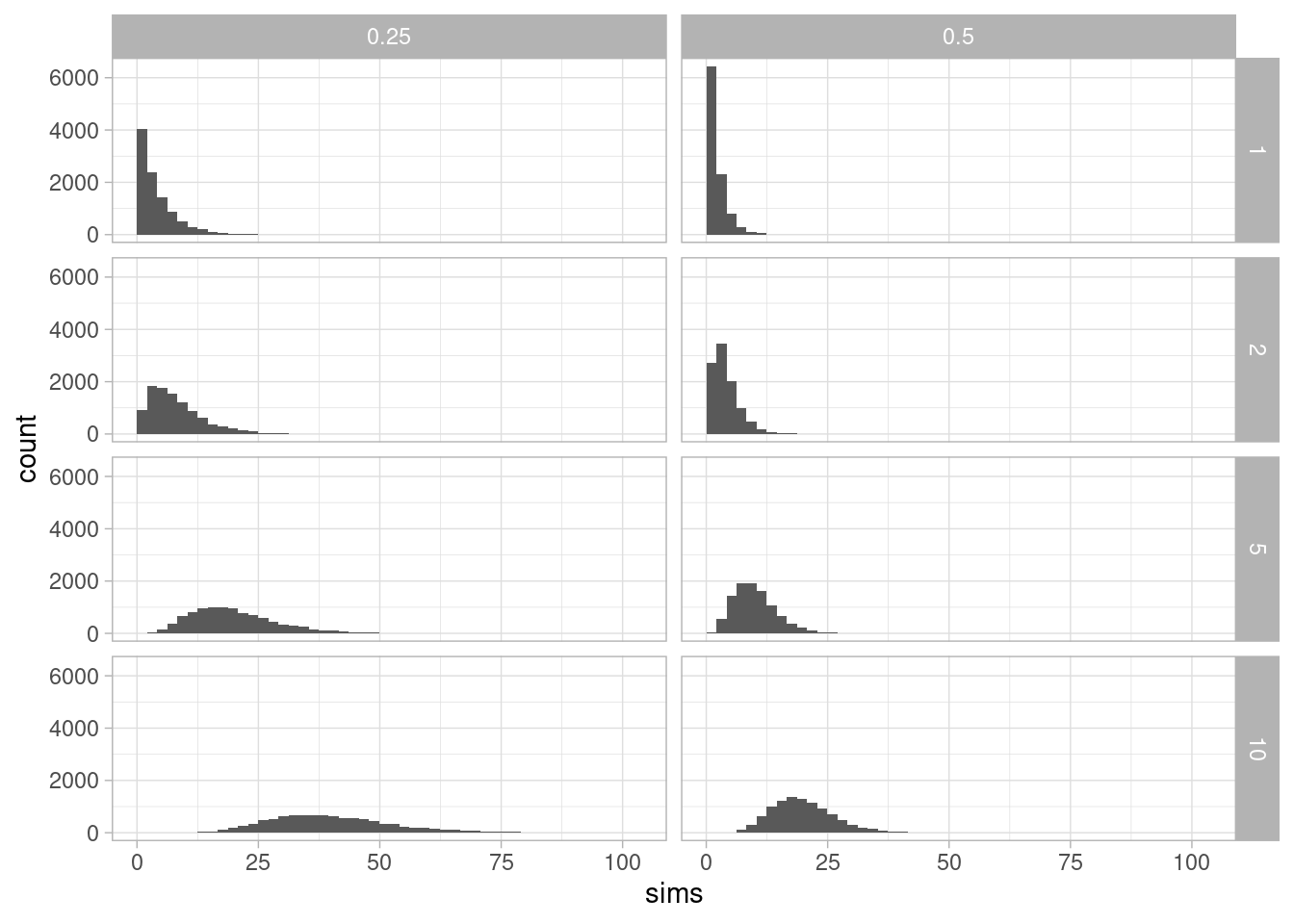 params_tbl <- crossing(k = c(1, 2, 5, 10), lambda = c(1/4, 1/2))