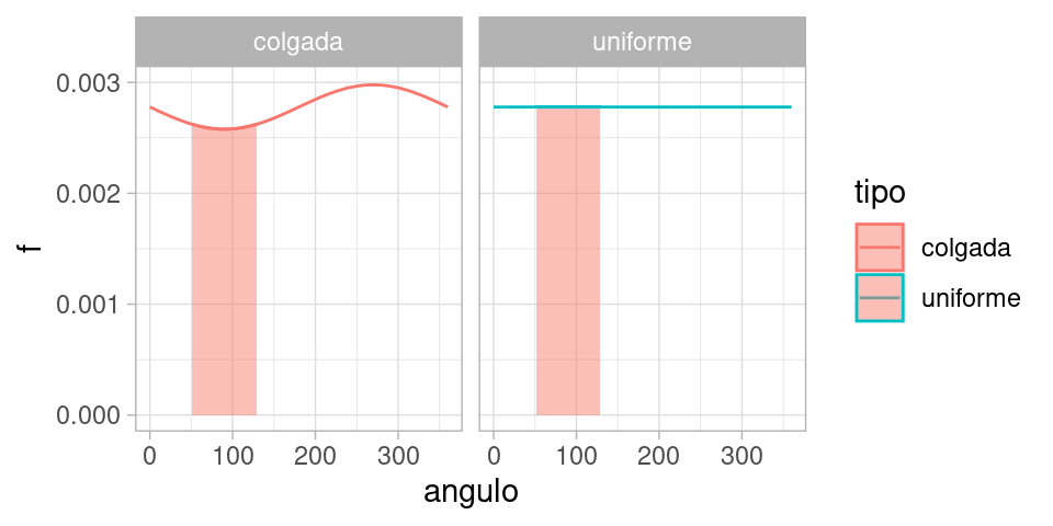 Y ahora vemos que para la versión perturbada, más de la probabilidad se concentra alrededor de 270 grados que alrededor de 90. Por las propiedades de la integral, todas las propiedades usuales de probabilidad se cumplen.