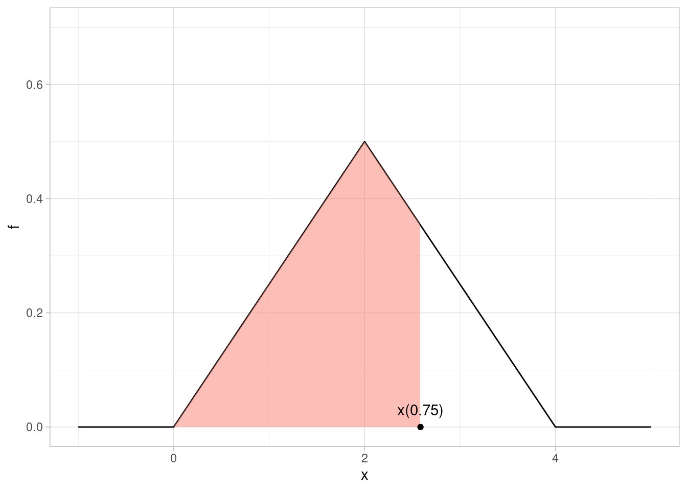 Supongamos que \(X\) tiene la densidad triangular mostrada arriba. Calcula el cuartil inferior y superior (es decir, los cuantiles 0.25 y 0.75). Para el cuartil superior, por ejemplo, buscamos al \(x(0.75)\) de la siguiente gráfica: