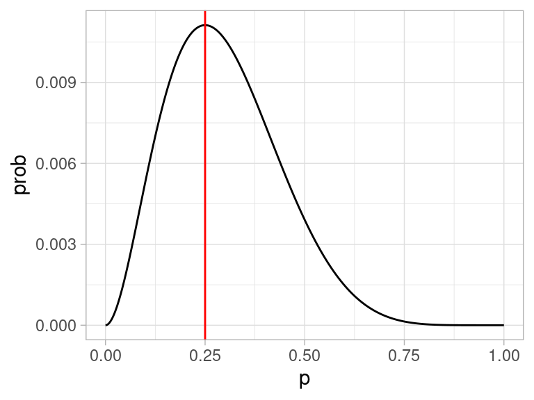 - Así que el estimador de máxima verosimilitud es \(\hat{p} = 0.25\)